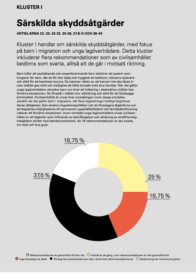 https://unicef.se/barnkonventionen/nya-lagforslag-strider-mot-barns-rattigheter - det här är sidan där du kan ladda ner dokumentet där UNICEF pekar ut vilka artiklar i barns rättigheter som tillämpas (grönt), vilka som är på väg att tillämpas (gult) och vilka som inte åtgärdas (rött). Tyvärr var dokumentförfattarna tvungna att skapa en fjärde färg, svart, för artiklar som höll på att ogiltigförklaras, och beslut fattades som gjorde det omöjligt att upprätthålla artiklarna. Och vitt infördes för artiklar som de inte kunde avge en bedömning av.