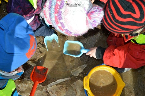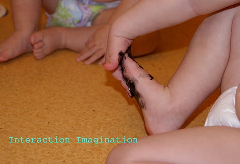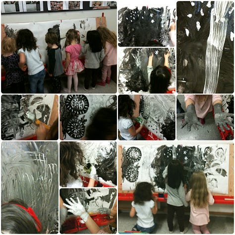 There were two pots of paint, one black and one white, each with a brush. The idea being that the children needed to talk to each other about swapping colours... giving them the chance to learn how to ask respectfully, how to say no respectfully, to be aware that others are waiting - and if you don't like to wait, maybe others don't either (theory of mind) and also to learn how to self regulate in order to wait - if you don't like having to change colours frequently, maybe others don't either? This was a way for the children to learn how to socially interact with each other. It was not conflict free, but I was there to support them if needed, by asking questions, and modelling sentences that could be used. After a week the children did not need the turn-taking list any more, they were able to organise themselves verbally. I have vivid memories of children standing a few centimetres away from another child’s ear, asking passionately "is it my turn yet?" on repeat. They learned that there was time to paint, that they could play and return to the Together Painting repeatedly and have several turns during the day. We also expanded how many children could stand at the wall easel and how many pots of paints were available as the children mastered the skills of negotiation.